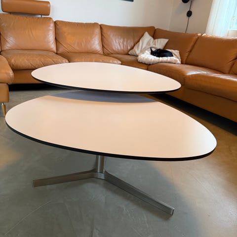 Sofabordssæt bestående af to ovale borde. Gode til fleksibel indretning, det lille bord kan stå helt inde under det store. Hvid bordplade, diskret sort kant og ben i krom/børstet stål. Sælges samlet.