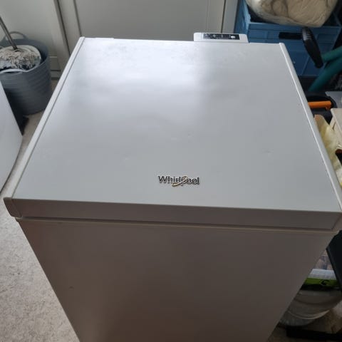 Whirlpool kummefryser med elektronisk kontrolpanel og flere temperaturindstillinger, herunder Eco, Normal, Max og Shopping. Fryseren har et rummeligt interiør med trådkurve til organisering af frosne varer.