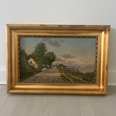 Oliemaleri - Kystlandskab med både og menneskefigurer; Signeret Eric With