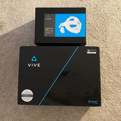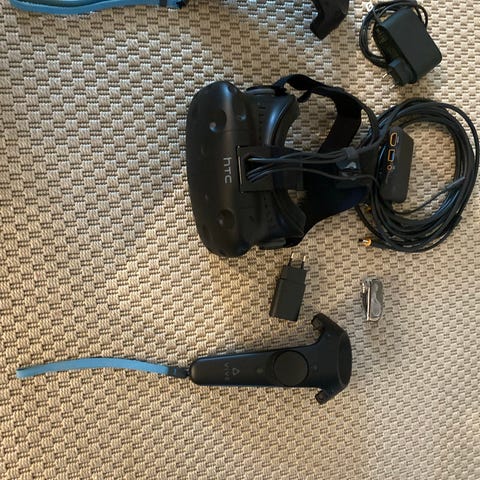 Komplet HTC Vive VR-headset med tilhørende controllere og sensorer. Inkluderer to håndholdte, to sensorer til rumtracking, alle ledninger og adaptere, to stativer til sensorer