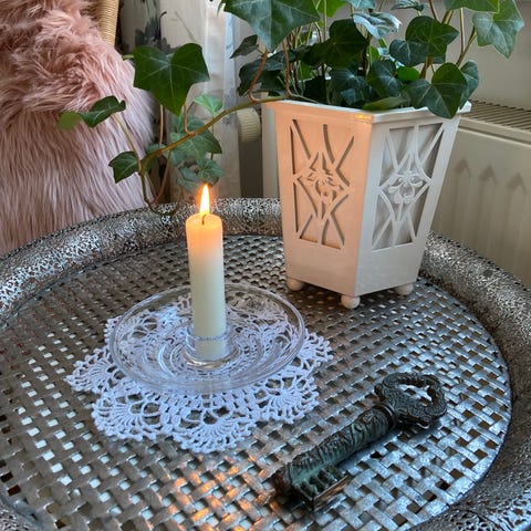 Diameter ca. 13 cm og højde ca. 3 cm.