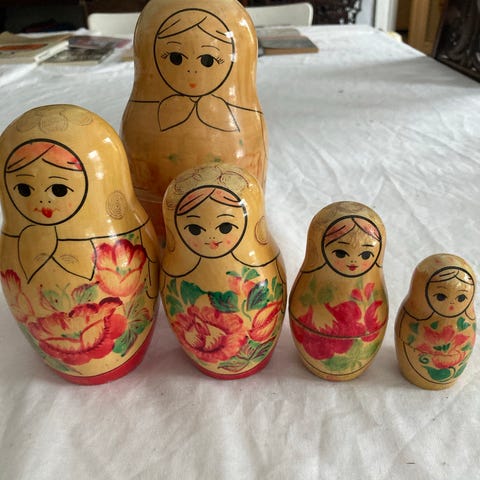 Sæt af russiske Matryoshka trædukker med håndmalede detaljer i forskellige størrelser og farver. Dukkerne er lavet af træ og viser traditionelle motiver med tørklæder og blomsterdekorationer.der er kun to der er hele festen er sat sammen men passer okke sammen. Køb det hele for. 40kr