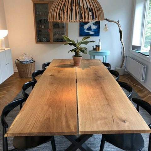 Håndlavet plankebord med to planker og L-ben fra Toka Design. Materialer er hvidolieret massivt egetræ. Sælges med tillægsplade.