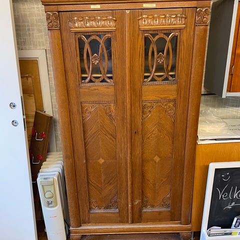 Antikt træskab med to glaslåger og hylder indvendigt. Skabet har dekorative udskæringer og en klassisk stil. Velegnet til opbevaring i hjemmet.