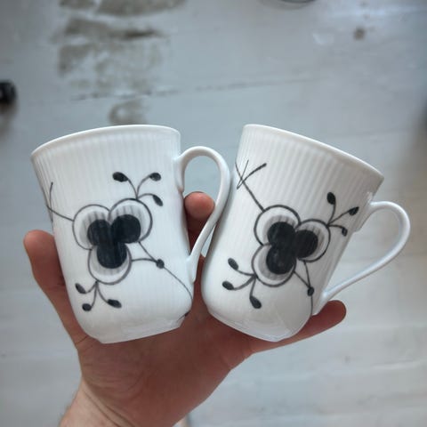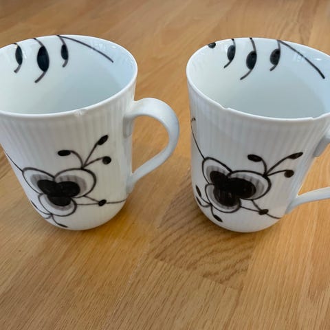 4 stk. Royal Copenhagen Sort Mega Riflet Krus. De sorte og grå dekorationer skaber et særligt, monokromt udtryk mod det hvide porcelæn og krusene på 36 cl er ideelle både som kaffekrus og tekrus.