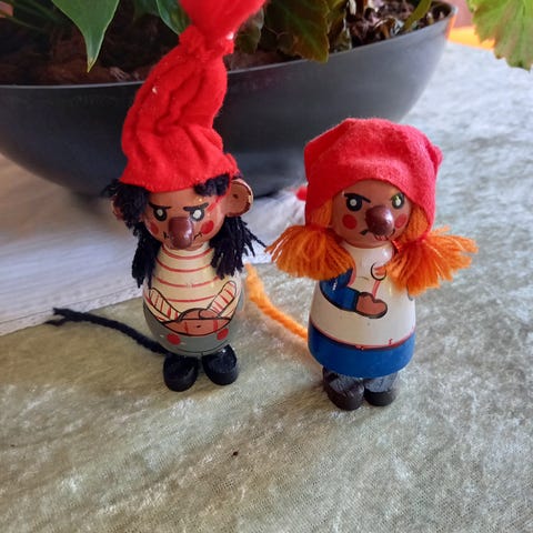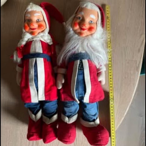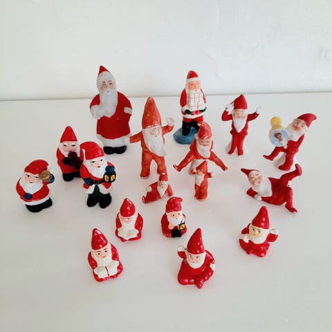 Sæt med forskellige julefigurer i stof og plastik i forskellige størrelser og farver. Figurenes design inkluderer nisser og julemand, velegnet til juledekoration. Sælges samlet 250 kr.