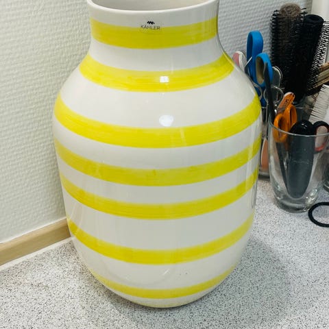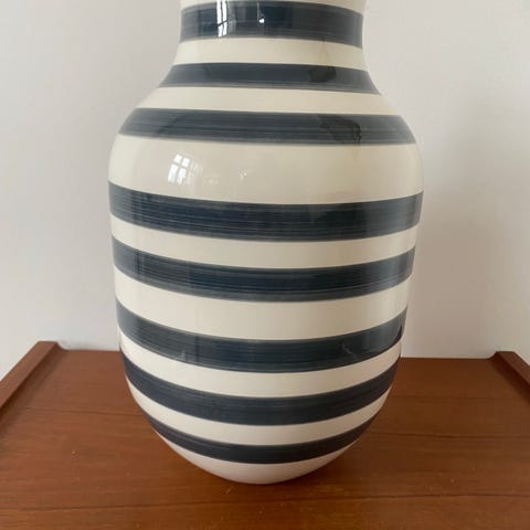 Kähler vase med sort og hvid stribet mønster. Vasen har en rund form med en smal åbning og er fremstillet i keramik. Den kan anvendes som dekoration i hjemmet til blomster eller som et dekorativt element.