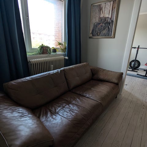 Læder overalt, så den kan også stå frit. Ingen skader. Med nakkehynder er den 100cm høj. Sæder 2x60cm, sædedybde 58cm, Chaiselongen er 70cm bred. Sofaen kan skilles uden værktøj (største mål adskilt er 120cm)