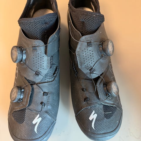 Specialized S-Works 7 i størrelse 44. De er lettere brugte. Der medfølger "røde" såler fra specialized.