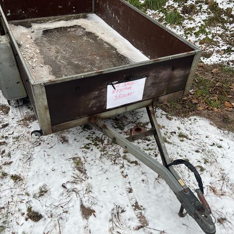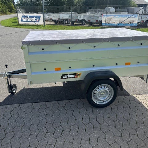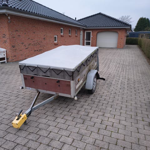 Trailer med presenning og støtteben. Traileren har 2 nye dæk og fælge.skruer skal spændes i bund.afhentes på adr