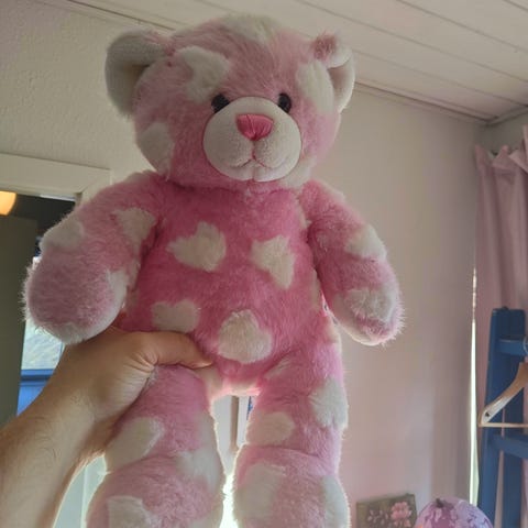 Denne bamse er 40 cm høj og har en blød, pastel flerfarvet pels i nuancer af lilla, lyserød og blå. Bamsen har et hvidt hjerte på maven og hvide ører med små sløjfer. Under fødderne er der et hjertemotiv med flerfarvede prikker. Kun stået til pynt
