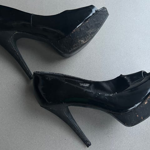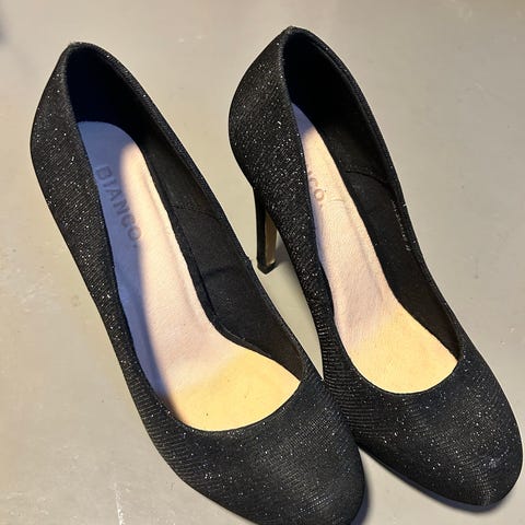 Et par sorte sko med høj hæl, størrelse 39. Skoene har en spids tå og en klassisk silhuet. Materialet fremstår som en form for stof eller ruskind. Hælhøjden er anslået til at være omkring 7-10 cm. Skoene har nogle tegn på brug, især ved hælen og sålen.