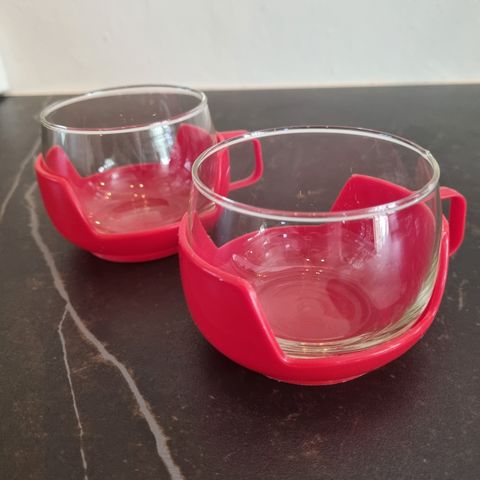 6 kopper og 4 underkopper i hvidt glasmaterial og med tryk på kopperne.Perfekte til retrohjemmet