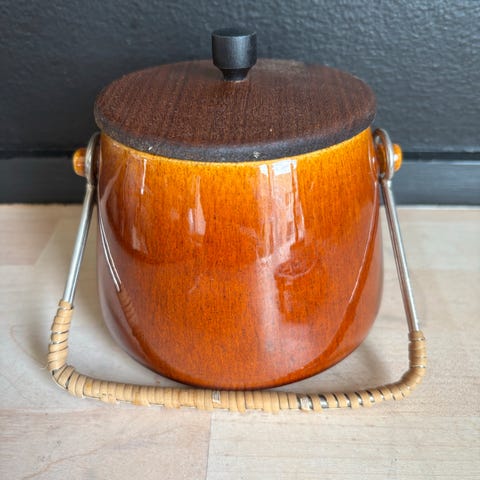 Rund krukke lavet af teaktræ med et aftageligt låg. Låget har en lille rund metalgreb på toppen. Beholderen måler 13 cm i diameter og 11 cm i højde. Træet har en mørkebrun farve og der er synlige åremønstre.