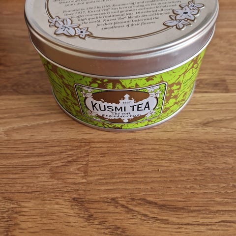 Dette er en dåse Kusmi Tea, der indeholder grøn the med ingefær og citron. Emballagen er en rund metalboks med en diameter på 10 cm og en højde på 8,5 cm. Dåsen er dekoreret med et grønt mønster og har et metal låg med blomsterdesign. Indholdet kan ses, når låget er åbent, og viser te-bladene tydeligt.