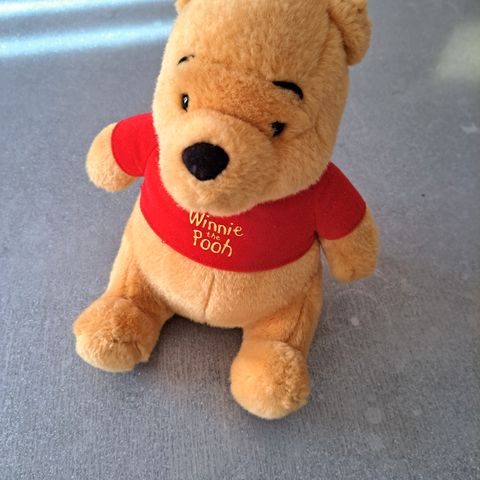 Denne bamse forestiller karakteren Winnie the Pooh. Den er gul og har en rød t-shirt på. Den er lavet af blødt plys materiale og måler cirka 24 cm i højden. Tags: bamse, plys, Winnie the Pooh, legetøj.