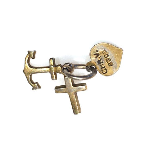Sølvanhæng i lille størrelse med tre charms: et kors, et hjerte og et anker. Anhenget kan bruges som vedhæng på en kæde, armbånd eller lignende. Det er lavet i metal og har en skinnende overflade. Størrelsen af anhenget er 1,5 cm.