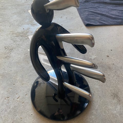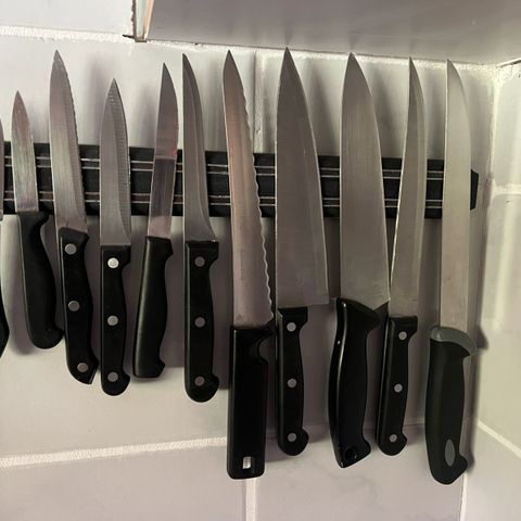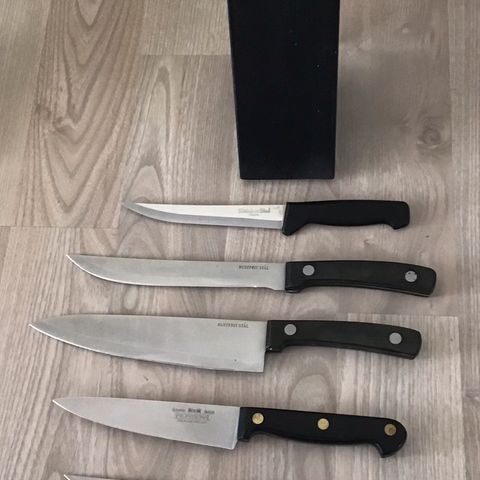 Dette er et komplet knivsæt, der inkluderer fem forskellige størrelser af knive samt en knivsliber. Knivene har sorte håndtag og er fremstillet af rustfrit stål, hvilket sikrer holdbarhed og langvarig skarphed. Den tilhørende knivblok er lavet af metal, hvilket giver en robust opbevaringsløsning.