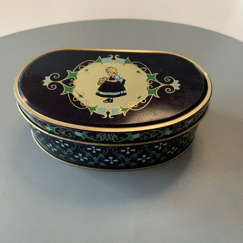 Hvid metal dåse med tekst (str. Ø 11 cm længde 15 cm) fra Irma