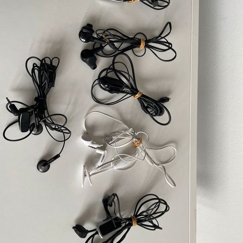 Sorte øretelefoner med kabel og 3,5 mm jack stik. Øretelefonerne har en indbygget mikrofon og kontrolknap på ledningen, som giver mulighed for at besvare opkald eller styre musikafspilning. Ledningen er lang og fleksibel, hvilket gør dem nemme at bruge til flere formål.