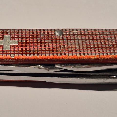 En schweizerkniv fra Victorinox med mørkegrøn plastikgreb. Kniven har flere funktioner såsom knivblad, skruetrækker og saks. Der er en lille ring i enden til fastgørelse til nøglering. Pakken, som kniven kommer i, bærer også Victorinox logoet. Denne model har 'BALL' mærket på knivens greb.