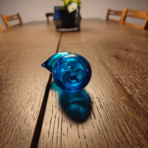 Glasfigur formet som en pingvin. Figuren er transparent og måler 11,5x7 cm. Lavet af Ronneby Sweden