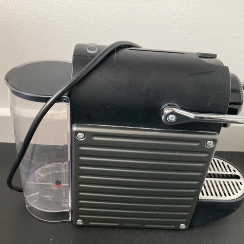 Nespresso kaffemaskine i sort farve. Kompakt design velegnet til brygning af espressokaffe. Indeholder aftagelig vandbeholder og drypbakke. Strømforsyning via ledning.