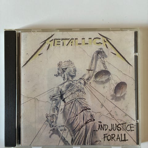 Metallica ...And Justice For All vinylplade med albumtitel og sangliste på coveret. Pladen indeholder sange som Blackened, ...And Justice For All, Eye of the Beholder, One, The Shortest Straw, Harvester of Sorrow, The Frayed Ends of Sanity, To Live Is to Die og Dyers Eve.