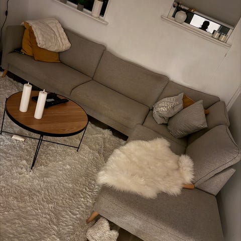 Sofa med cheselong. Er 250cm lang og cheselong er 160cm. Katten har desværre haft klørene i den et par steder som vist på billedet men eller blot brugt. Kan skilles ad i to dele for transport. Afhentes hurtigst muligt i Rødovre. Gratis.