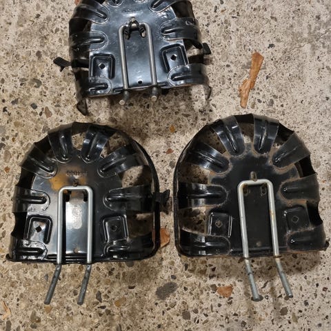 Dette er en Bulldog saddel, sandsynligvis til en cykel. Den er 23 cm bred og har en metallic base med en lysegrå overflade. Den kommer med en metalbeslag, som kan bruges til at fastgøre den. Der er nogle tegn på slitage i form af små ridser og pletter på overfladen. Saddelen ser robust ud og er lavet af metal.