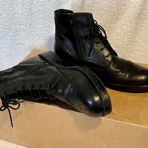 Et par sorte ankelstøvler i størrelse 36. De har en robust sål med godt greb og er udstyret med lynlås på siden for nem på- og afklædning. Støvlerne har en solid hæl og er lavet af læder. Designet er enkelt og alsidigt.