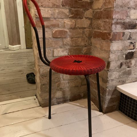 Lille retro stol i metal med vinylsæde og -ryg. 45 cm sædehøjde. Står stabilt men er noget rustik at se på med mange pletter og mærker.