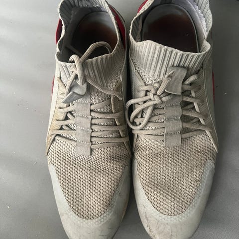 Disse sko fra Engelbert Strauss er i størrelse 43 og har en grå overflade med hvide snørebånd og røde detaljer ved snøringen. Skoen har en hvid og sort stribet sål, der giver den et sporty look. Ydersålen er sort med et mønster for bedre greb og har mindre tegn på brug.