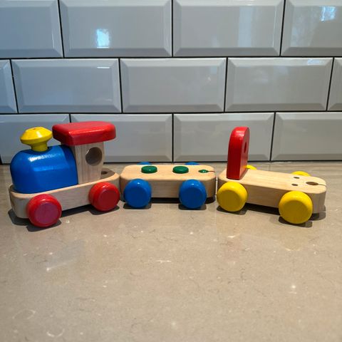 Legetøjstog i farverne rød, gul, grøn, og blå. På togstammen er der figurer af dyr og musiknoter. Der er forskellige formede knapper, som kan trykkes på for at producere lyde eller musik. Der er en snor på forsiden, så toget kan trækkes. Toget er interaktivt og kan hjælpe med at stimulere sensoriske og motoriske færdigheder hos børn.