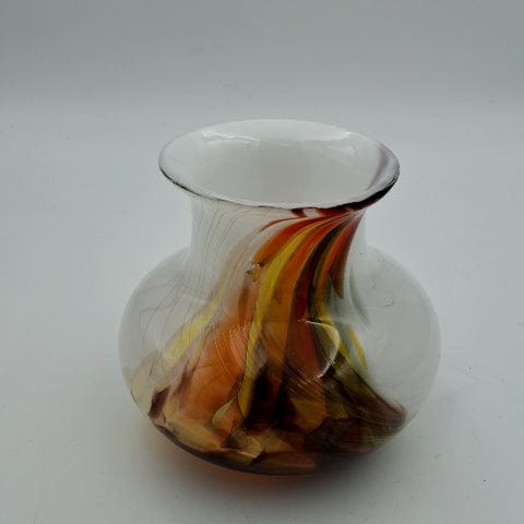 25 cm høj og lavet af glas. Den har en hvid overflade med dekorative farverige mønstre, der skaber et kunstnerisk udseende. Bagsiden af vasen er ensfarvet hvid, mens forsiden har en blanding af forskellige farver inklusiv rosa, turkis, lilla, og sort, som danner et abstrakt design. Vasen kan bruges til blomster eller som ornamental dekoration i hjemmet.