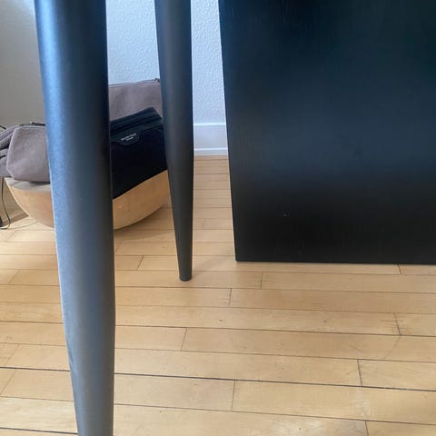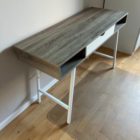 Sort skrivebord i metal med hylde og skab til opbevaring eller til at gemme harddisk væk. Vi har ikke brugt det meget, det har mest bare stået og samlet støv 😉 underlag til tastetur kan medfølge.