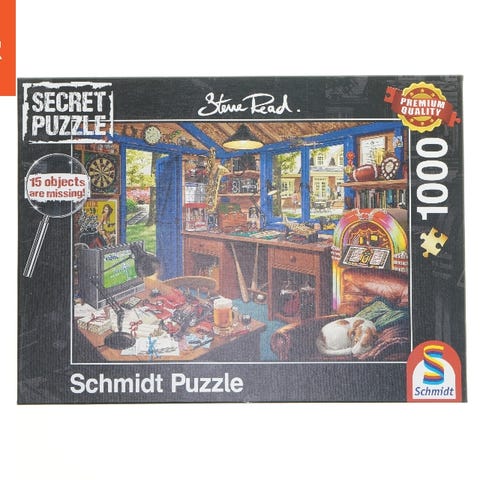 Dette er et Schmidt mærket puslespil med 1000 brikker, kendt som Secret Puzzle. Forsiden af kassen viser et detaljeret kunstværk af Steve Read, der skildrer et hyggeligt indendørsmiljø med en symaskine, dekorationsartikler og åben vindue med udsigt. Puslespillet indeholder 15 skjulte objekter som en ekstra udfordring. Bagsiden af kassen beskriver puslespillets kvalitetsegenskaber og viser billeder af forskellige scener fra puslespillets serie. Tags: puzzle, schmidt, 1000 brikker, secret puzzle, steve read.