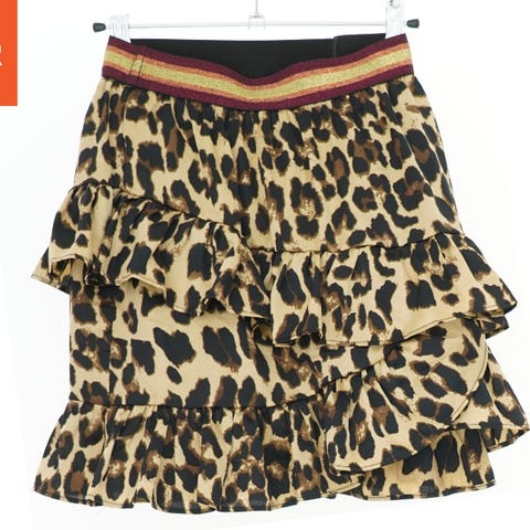 Dette er et sæt bestående af en trøje og bukser i leopardmønster. Trøjen har en lynlås foran og sorte manchetter ved ærmerne og nederste kant. Bukserne har en elastisk talje med gyldne knapper til dekoration. Begge dele er dekoreret med sorte kantdetaljer.