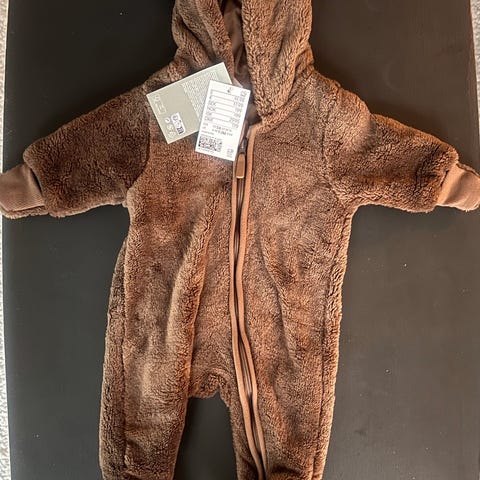 En heldragt til baby i beige farve fra mærket H&M. Dragten har knapper foran og lange ærmer. Den er designet med fødder, så barnets fødder også er dækket. Størrelsen er 62, hvilket er passende til nyfødte eller små babyer. Materialet ser ud til at være behageligt for barnet.