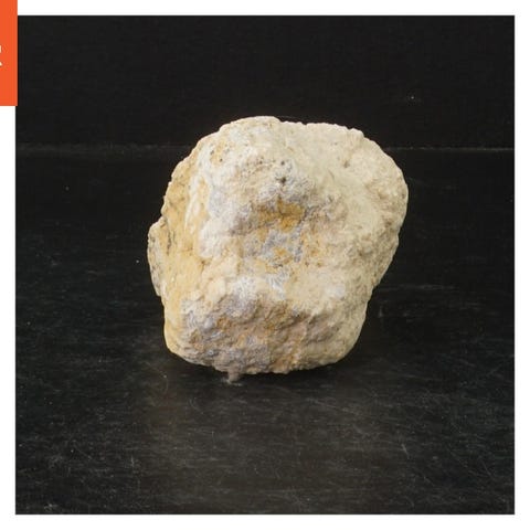 Geode-klippestykke med en grov ydre overflade af lys beige farve og en hul indre del, der afslører hvidaktige krystaller. Har naturlige ujævnheder og en ru tekstur på ydersiden.