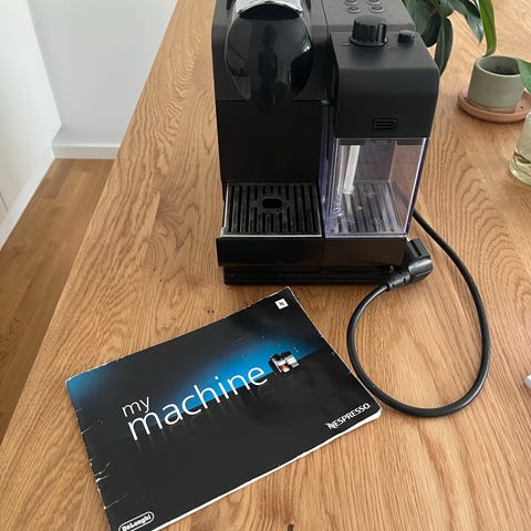 De'Longhi Nespresso Lattissima kaffemaskine i sort farve. Maskinen er designet til at brygge espresso og andre kaffedrikke med Nespresso-kapsler. Den har en integreret mælkeskummer til tilberedning af cappuccino og latte. Kaffemaskinen har et brugervenligt kontrolpanel og et aftageligt vand- og mælkebeholder for nem rengøring og påfyldning.