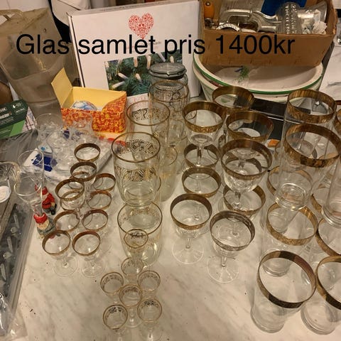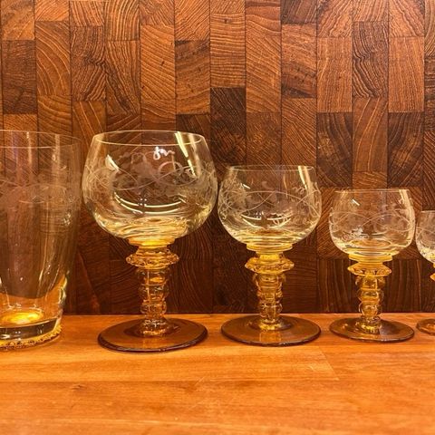 Sæt bestående af 4 glas med dekorativ guldkant og indgraveret mønster. Glassene er klare og har en bred åbning med en smal fod. Velegnet til servering af drikkevarer og eller små desserter