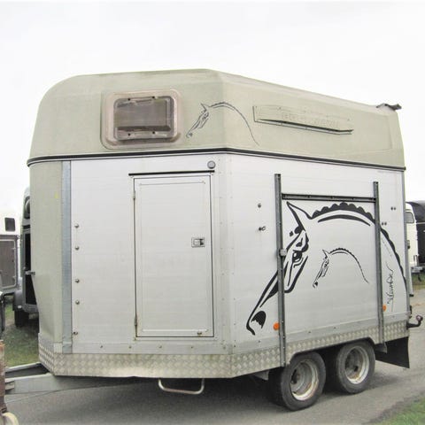 Böckmann hestetrailer i grå farve. Traileren har plads til flere heste og er udstyret med bagdøre, sidevinduer og en reservehjul monteret på siden. Indvendigt er traileren hvid med beskyttende paneler og et gulv med alu bund.Traileren er egnet til transport af heste. Syn sidste år