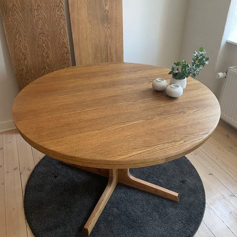 Spisebord fra Farstrup inkl. tillægsplade. Bordet har en højde på 73 cm. Ø. 110 cm uden tillægsplade / 157,5 cm inkl. tillægsplade.