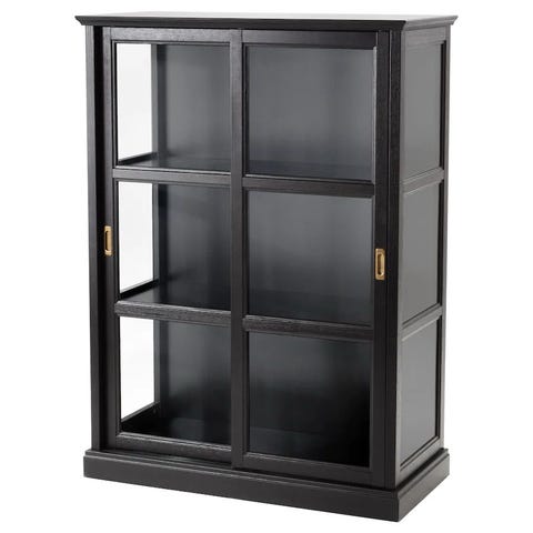 IKEA vitrineskab med ramme i sortblå metal og glasdøre.