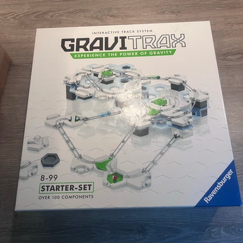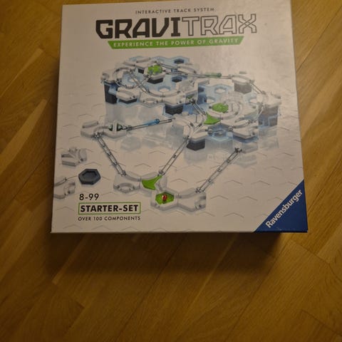 Gravitrax Starter-Set er et børnelegetøj designet til aldersgruppen 8-99 år. Sættet indeholder over 100 komponenter, der kan bruges til at bygge og udforske gravitationsbaserede baner. Materialerne inkluderer forskellige plastdele i farverne hvid, grøn og grå. Sættet leveres i en æske med dele til at konstruere og eksperimentere med kuglebaneelementer.