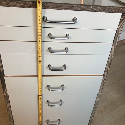 Gl fransk metalkasse fra tandlægeklinik el lægeklinik m 5 udtrækshylder skuffer