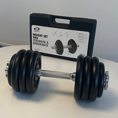 Sæt med håndvægte og vægtskiver i sort støbejern. Indeholder to håndvægte med gevindstænger og vægtskiver i forskellige størrelser. 4 stk 0,5 kg, 4 stk 1,25 kg og 4 stk 2,5 kg. Velegnet til styrketræning og fitness.