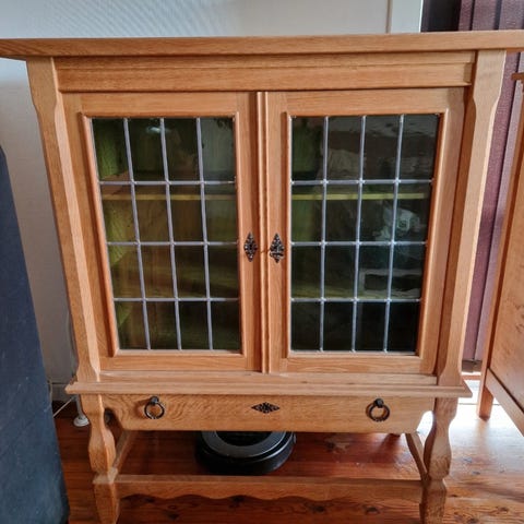 Flott skænk i oliereserver eg med glas døre og glas hyller. Den er tung, står på møbelhund klar til transport. Kan leveres mod et mindre transport tillæg indenfor 70km.