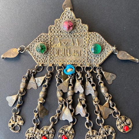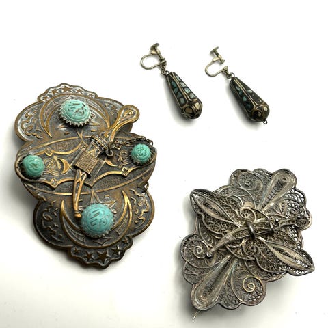 Vintage indisk sølvsmykke med karneol med øsken og senere monteret pin. Højde 10 cm